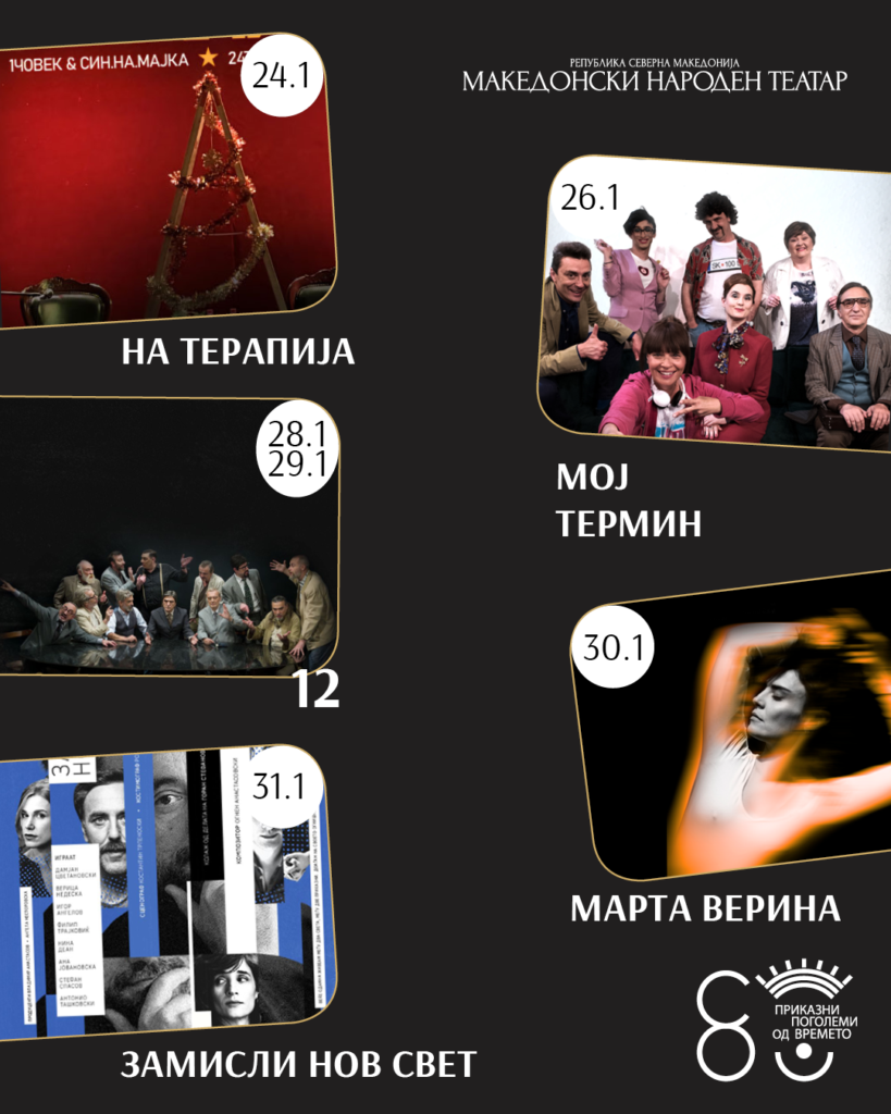 На 26 јануари на репертоарот е „Мој термин“, а на 28 и 29 јануари се изведбите на претставата „12“.