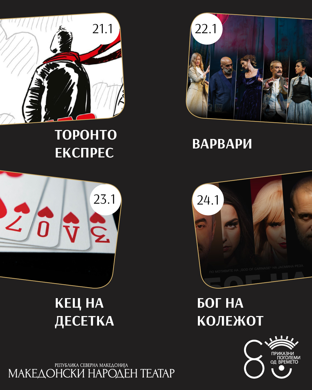 Репертоарот продолжува на 20 јануари со претставата „Народен пратеник“, а на 21 јануари следува монодрамата „Торонто експрес“. На 22 јануари ќе биде изведена драмата „Варвари“, а на 23 јануари на репертоарот е претставата „Кец на десетка“.