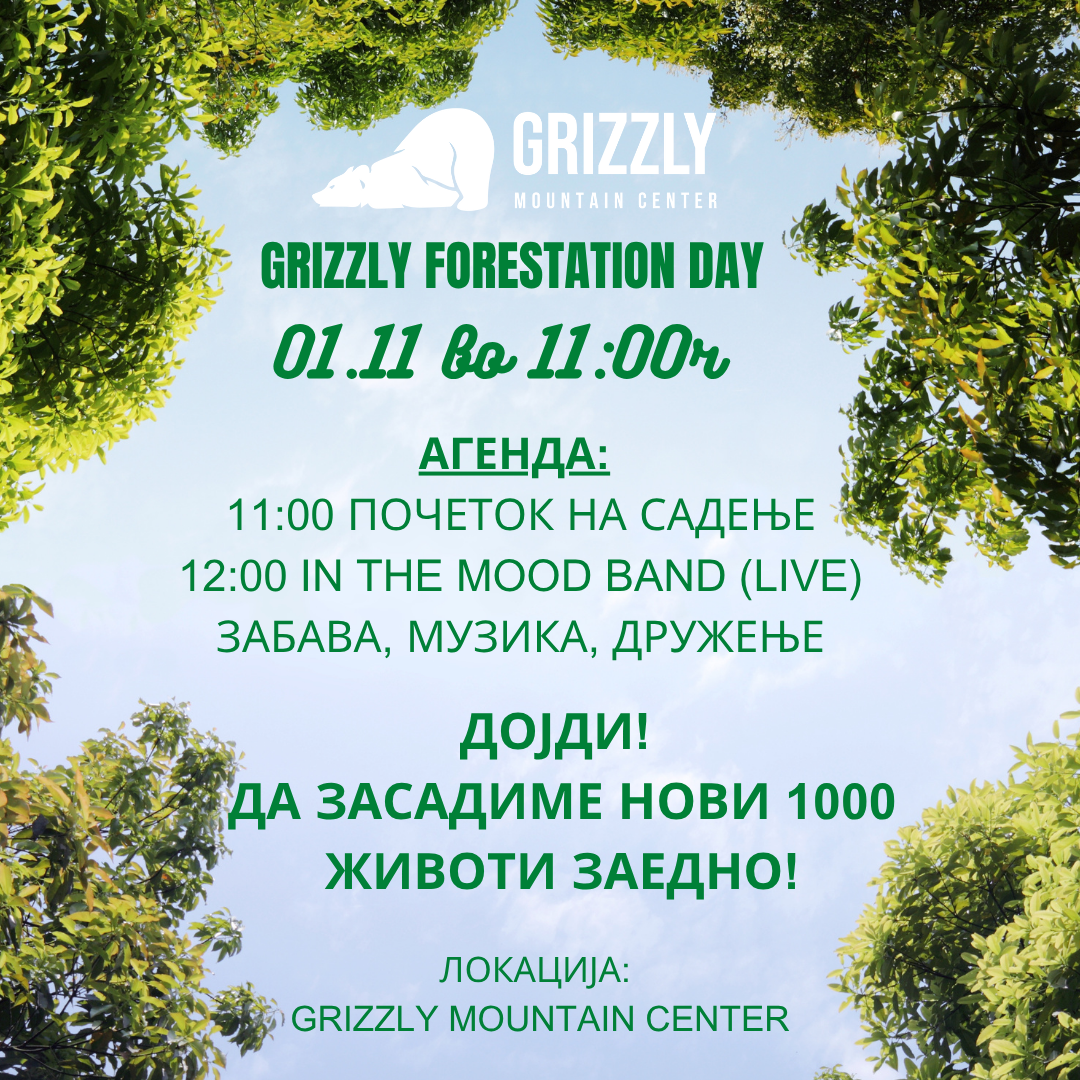 Во сабота, 1 ноември со почеток во 11 часот, центарот го отвора месецот на пошумување со настанот „Grizzly Forestation Day“ под мотото „Да засадиме нови 1000 животи заедно!“ Учесниците ќе можат да подигнат садници пред ресторанот и заедно да учествуваат во акцијата за садење, проследена со музика, дружење и настап во живо на In The Mood Band.