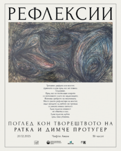 Атриум го најавува отворањето на ретроспективната мултимедијална изложба насловена „Рефлексии“ во Националната Галерија Чифте Амам на 20 декември со почеток од 19 часот, што ќе приближи поглед кон животот и творештвото на непокорните брачни другари, партизанката и авторка Ратка Ковачева Протугер и ликовниот уметник Димче Протугер.
