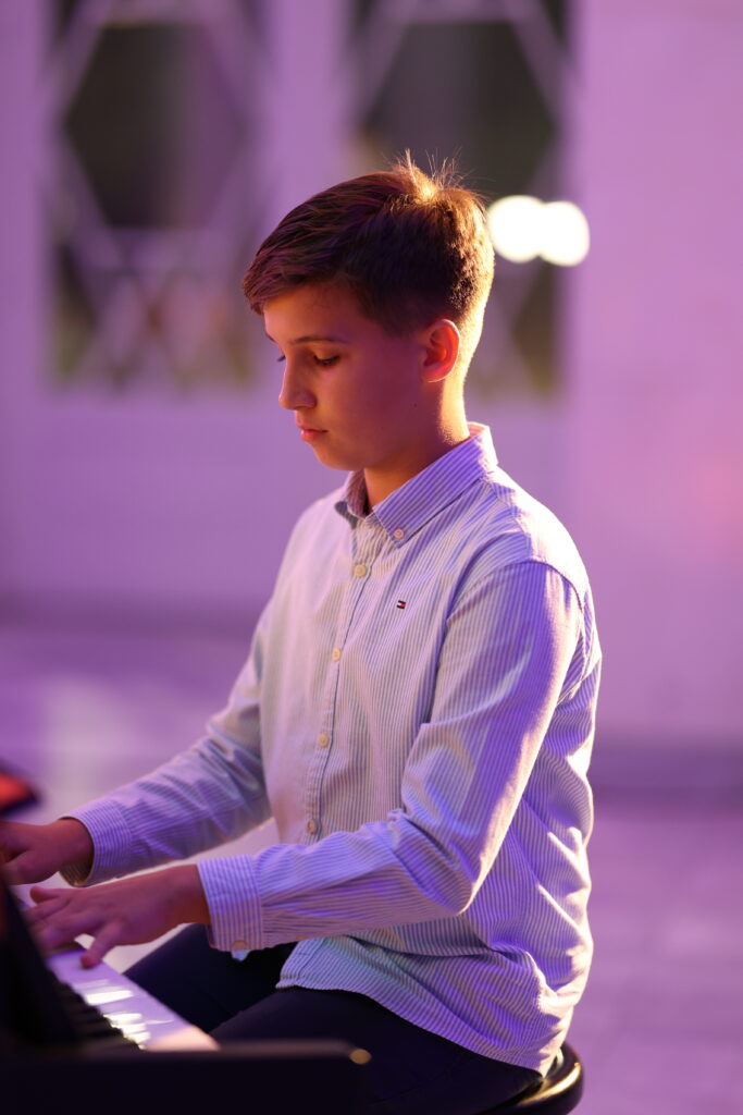 Првиот тон вечерта го донесе Алексeј Белевски – дете од Битола со свои дванаесет години и со биографија што LinkedIn не ја поднесува. Карнеги Хол, Виена, Белград, награди колку што ние имаме неплатени сметки. Ние на таа возраст уште купувавме касети, а тој веќе свири на сцени што изгледаат како соништа. Најубавото е тоа што не се обидува да биде „голем“. Едноставно е искрен. И токму затоа е голем.