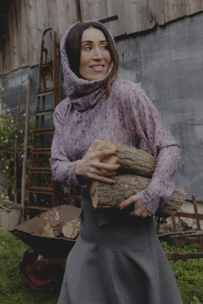 Во „The Tenth Wagon“ куќата ја користам како метафора за жената – како жив, подвижен систем што постојано се обновува, преместува и прераскажува себеси. Во визуелниот и текстилниот јазик ги отворам просторите на ранливост, местата каде жената се крши, но и повторно се составува; просториите во кои се чуваат нејзините наследени приказни, стравови и мали бунтови што ја обликуваат. Истовремено, одредени „простории“ намерно остануваат затворени. Не како тајна, туку како право – право на мистерија, на недостапност, на сопствена сенка. Колекцијата не настојува да ја објасни жената, туку да ја допре. Така „The Tenth Wagon“ ја гледа жената како дом што не може целосно да се прочита: слоевит, сложен и свесно недовршен.