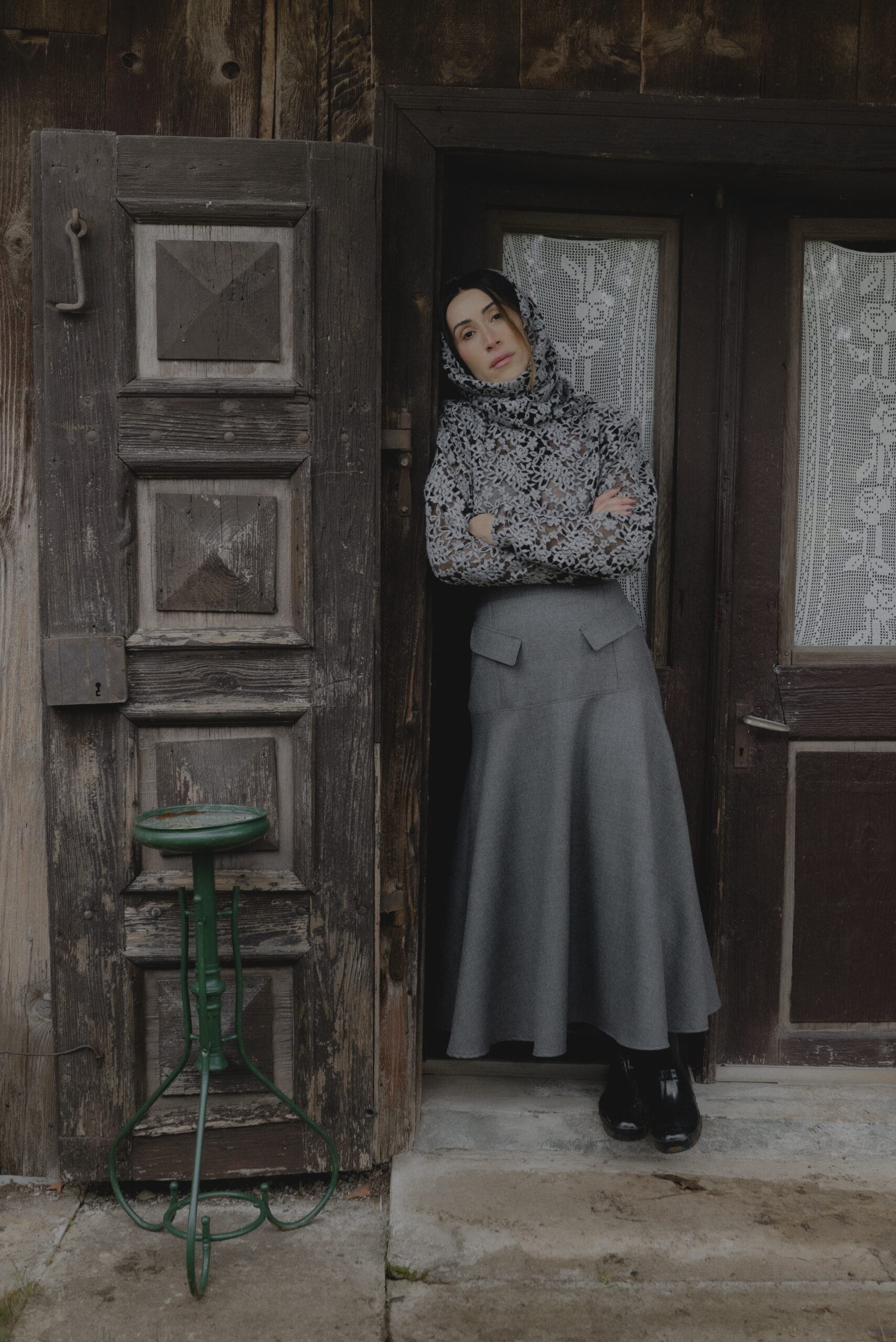 Во „The Tenth Wagon“ куќата ја користам како метафора за жената – како жив, подвижен систем што постојано се обновува, преместува и прераскажува себеси. Во визуелниот и текстилниот јазик ги отворам просторите на ранливост, местата каде жената се крши, но и повторно се составува; просториите во кои се чуваат нејзините наследени приказни, стравови и мали бунтови што ја обликуваат. Истовремено, одредени „простории“ намерно остануваат затворени. Не како тајна, туку како право – право на мистерија, на недостапност, на сопствена сенка. Колекцијата не настојува да ја објасни жената, туку да ја допре. Така „The Tenth Wagon“ ја гледа жената како дом што не може целосно да се прочита: слоевит, сложен и свесно недовршен.